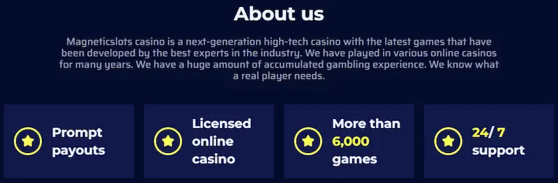 The Magnetic Slots Casino catalog exceeds 6,000 titles, covering all categories expected on a modern platform. This diversity is one of the main arguments in our Magnetic Slots review